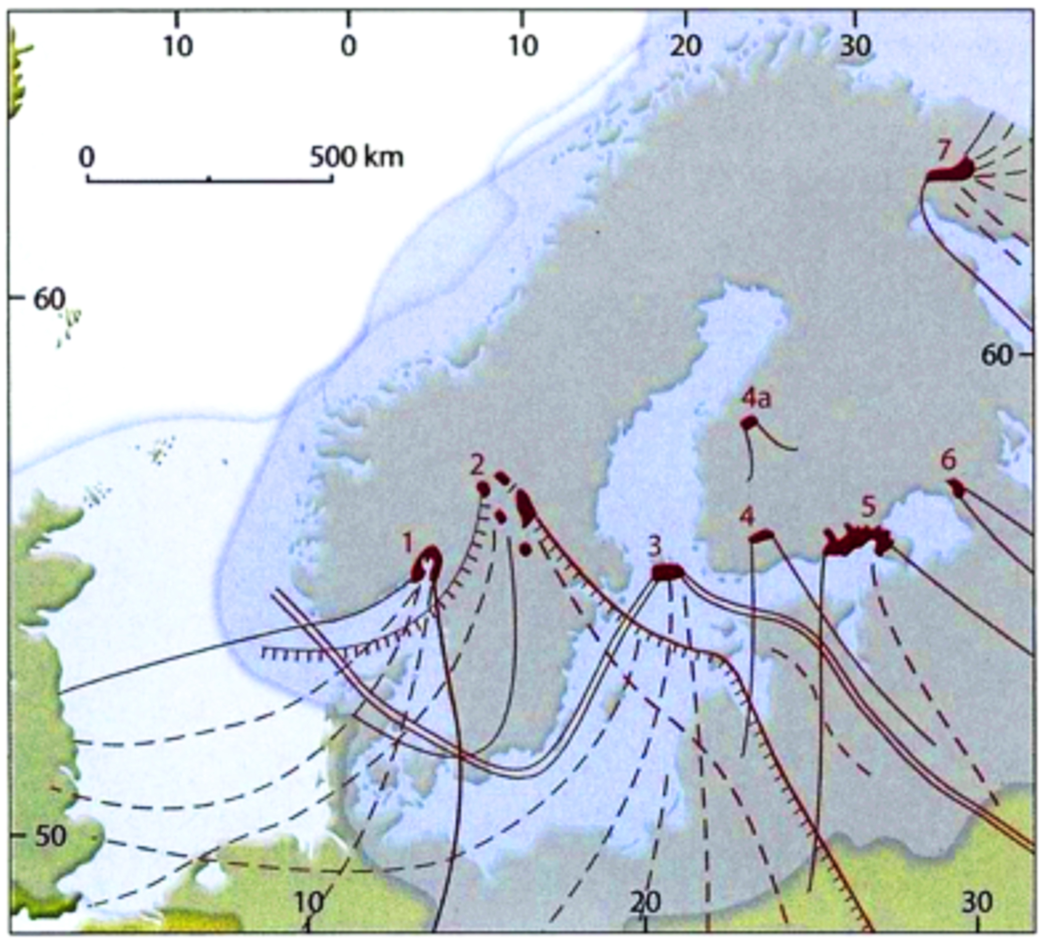 Kortet viser såkaldte blokspredningsvifter for nogle udvalgte ledeblokke. Vifterne viser ikke udbredelsen af blokke i forbindelse med ét isfremstød, men spredningen gennem alle kvartærtidens fremstød. Vifterne udgår fra ganske bestemte områder med fast klippe, hvorfra ledeblokkene er revet løs.