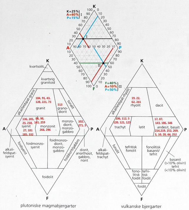Tager vi nu eksemplet ovenfor (K=25 %, A=60 % og P=15 %) og går ind i diagrammet nederst til venstre, kan vi se, at en plutonisk bjergart med 25 % kvarts, 60 % kalifeldspat og 15 % plagioklas er en granit, medens en vulkansk bjergart med samme sammensætning er en rhyolit.