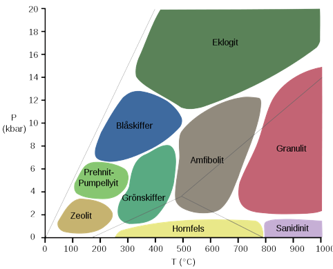 Metamorfe bjergarter inddeles efter facies. Et bestemt facies fortæller, hvilken temperatur og dybde bjergarten er dannet under: