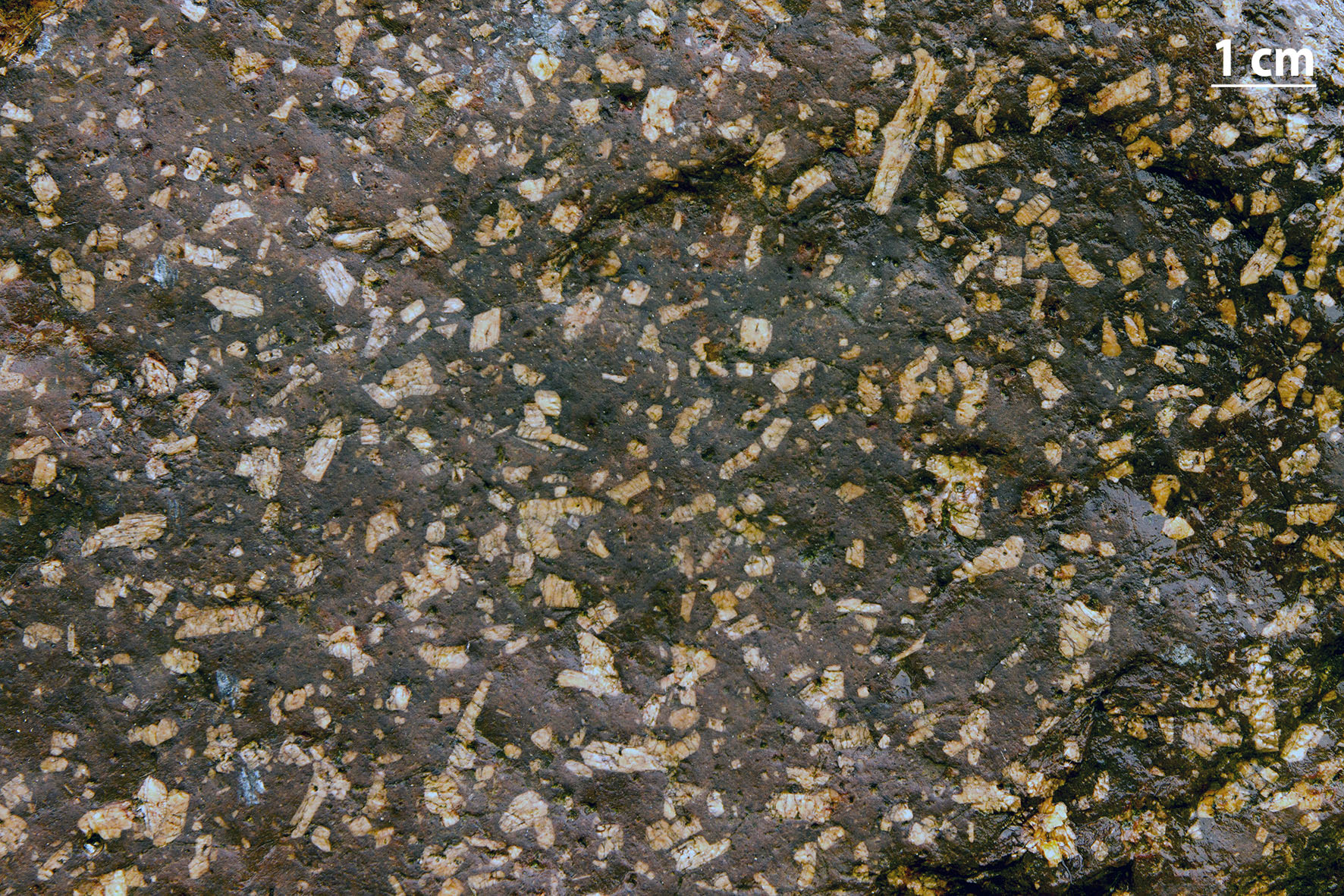 Grundmassen varierer fra olivenbrun (gråbrun) over chokoladebrun til rødbrun. Op til 2 mm store, dybtgrå, uanselige kvartsstrøkorn, som ses tydeligst på en brudflade. Mange tætliggende, 1-5 mm store feldspatkorn af to slags: Rosa/rødlige/rødbrune kalifeldspatter og færre, mindre næsten hvide plagioklaser. Mange små (1-2 mm) strøkorn af sorte mineraler, bl. a. augit, som ofte er forvitret til klorit (grønligt). De slides ud, så en rullestens overflade bliver oversået med små huller. Ofte findes indeslutninger af fremmede bjergarter.