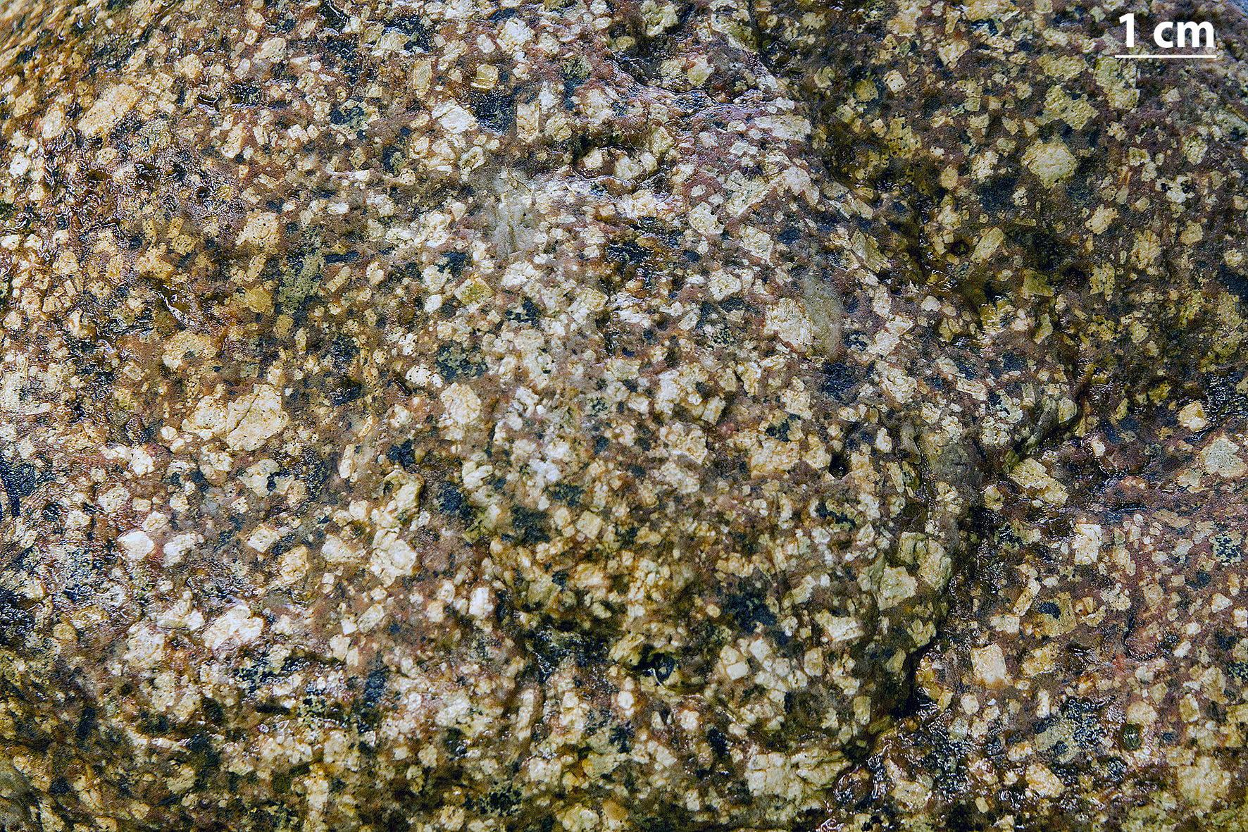 Grundmassen varierer fra næsten lyserød over rosagrå og gråbrun til rent grå. Strøkornene fylder altid langt mere end halvdelen af stenens masse, og mellemrummene er aldrig over 3 mm. To slags plagioklaskorn: Mange hvidlige/gullige (1-10 mm) af Na-plagioklas og færre gulgrønne/snavsetgrønne (2-12 mm) af Ca-plagioklas. Af og til ses et enkelt, rosafarvet korn af kalifeldspat. Runde til sekskantede, sorte korn af biotit (1-3 mm). Lange (nåleformede) korn af hornblende (1-4 mm). Ofte 1-2 cm grøn-sorte aggregater af hornblende, epidot og klorit.