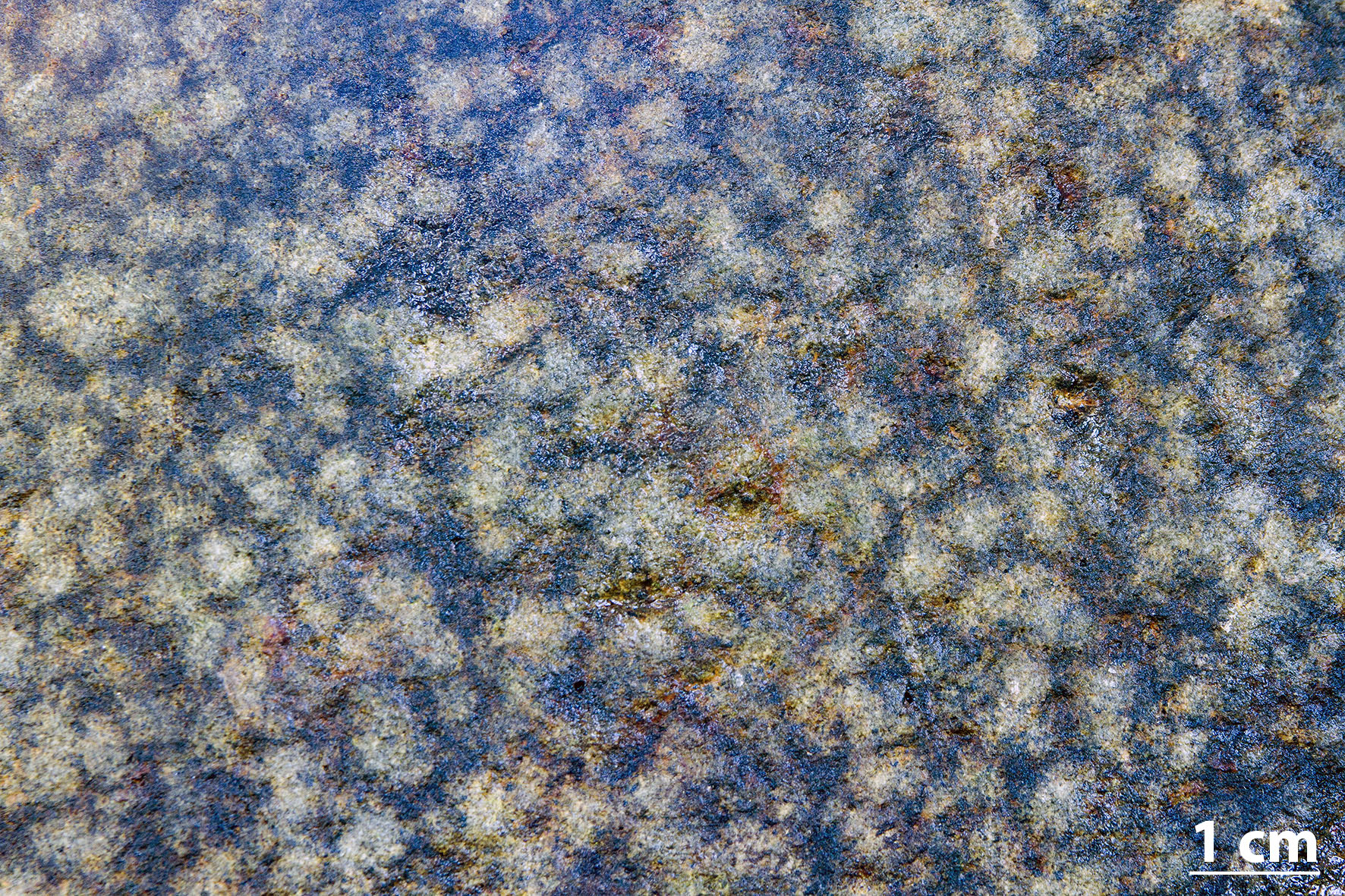 Gråsorte, 2-8 mm store augitkrystaller med rundagtigt omrids gennemvokses af mange ca. 1 mm lange lyse plagioklaslister. Mellem augitkrystallerne findes olivinkorn, der netop er synlige i lup. Mange af dem er omdannet til rust.