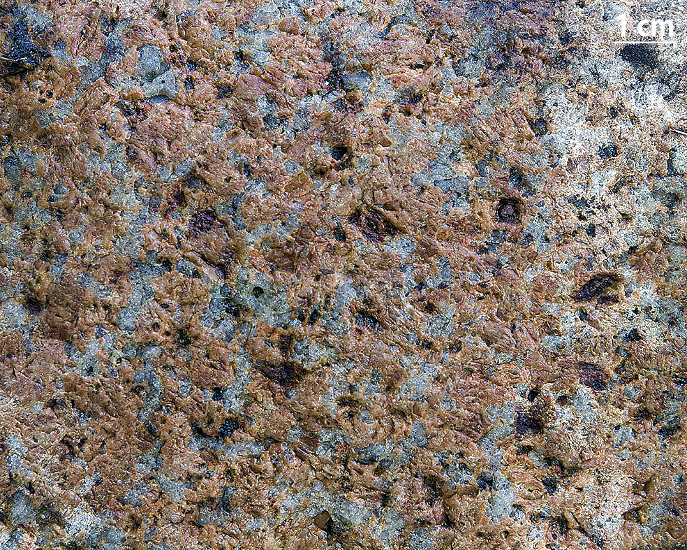 70 % af bjergarten er kalifeldspat i matrøde eller lyst brunrøde partier, der som regel hænger sammen og kun hist og her har karakter af øjne; krystaller flere cm store. Kvarts i 3-10 mm store korn er karakteristisk; de ligger i rækker eller afbrudte ringe om nogle af de store kalifeldspatter. Plagioklas i hvide pletter, 3-10 mm. De få, små korn af biotit ligger i kvartsringene.
