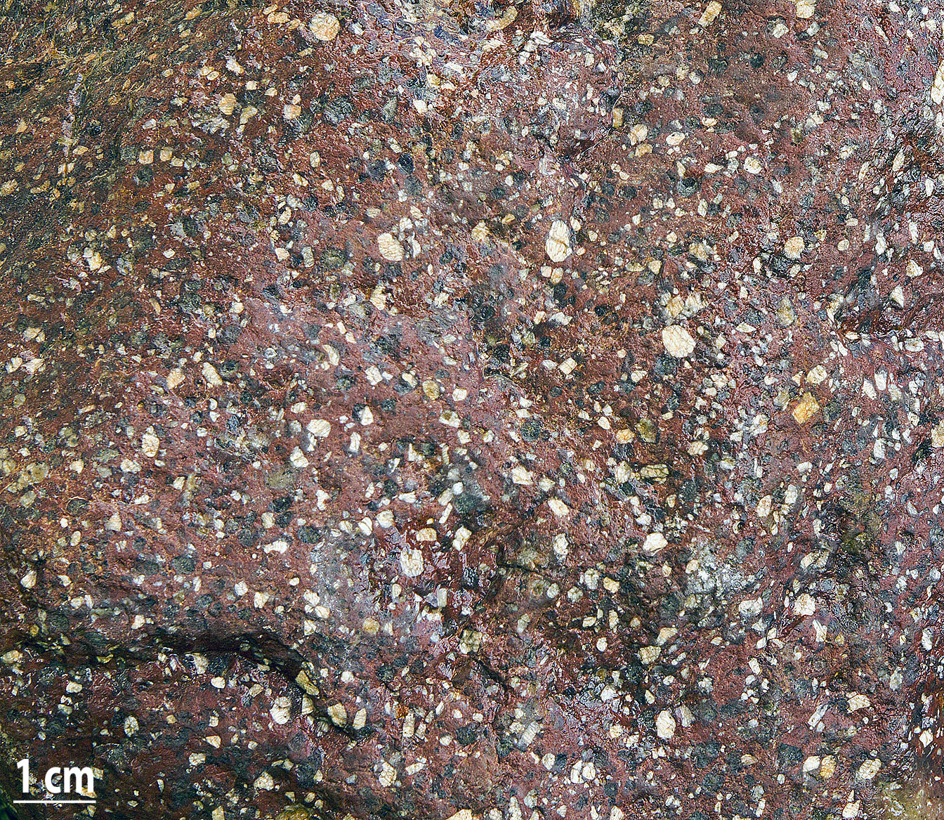 Rød, tæt grundmasse. ½ til 5 mm store, runde, lysegrå kvartsstrøkorn. ½ til 3 mm store, meget talrige strøkorn af kalifeldspat, hvoraf de fleste er hvide/meget lyse; nogle er dog rosastribede eller lyst brunlige. Få grønhvide plagioklaskorn. Nogle varianter har mørk grundmasse og/eller cm-store, røde kalifeldspatter.