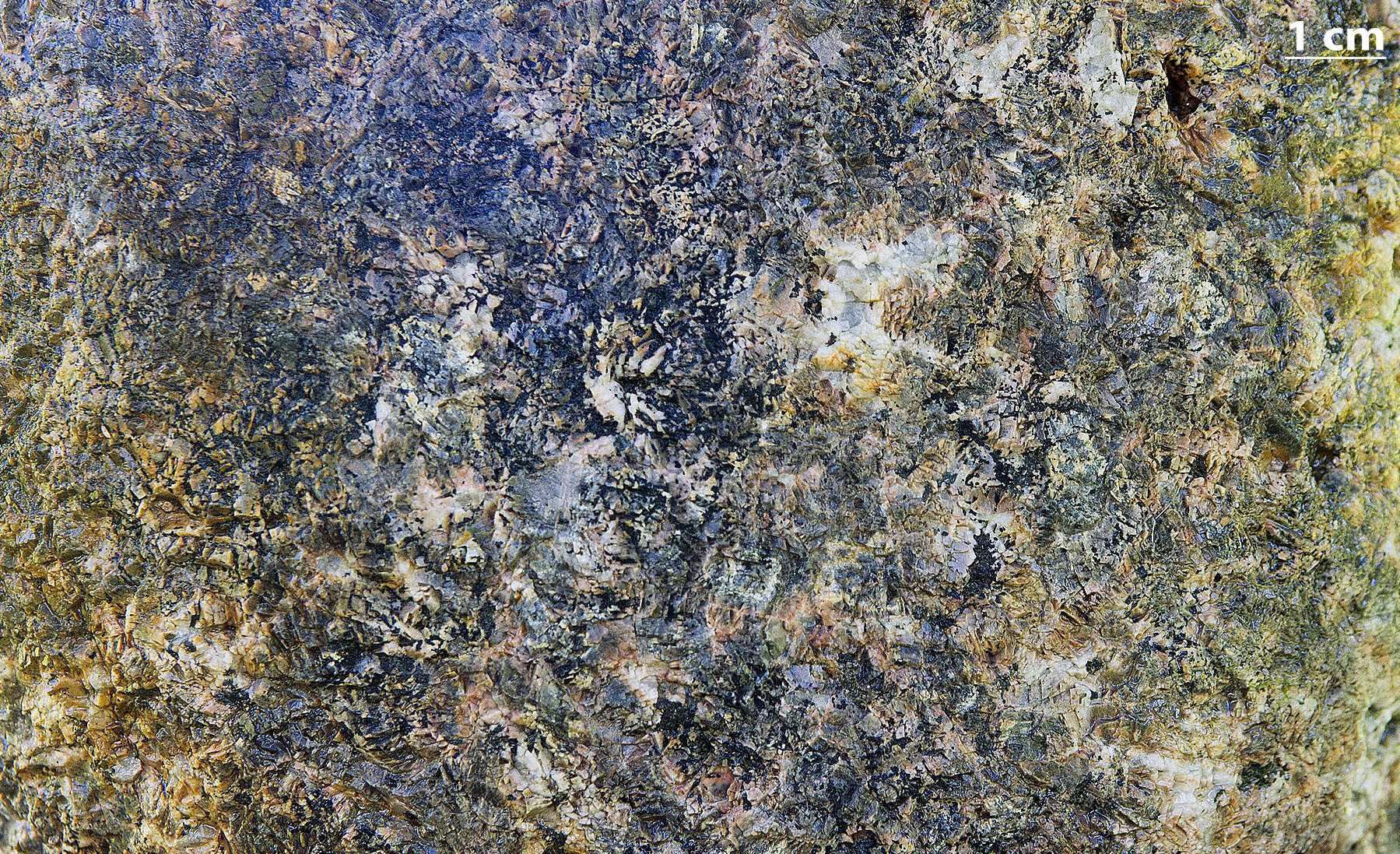 Indholdet af kalifeldspat er op til 90 % af bjergarten. Farven er gulbrun, lyst rosa eller næsten hvid. Kornstørrelsen veksler fra ca. 2 mm (finkornet) til ca. 1 cm (grovkornet). Op til 15 % kvarts i tydelige, lysegrå, 2-5 mm store korn. Sorte mineraler er i de fleste tilfælde samlet i skarpt begrænsede, 3-10 mm store, kantede hobe. Der kan være tale om biotit. I småkornede varianter kan de være mere fint fordelt. Der er da som regel tale om hornblende i søjleformede og augit i kortere, bredere krystaller.