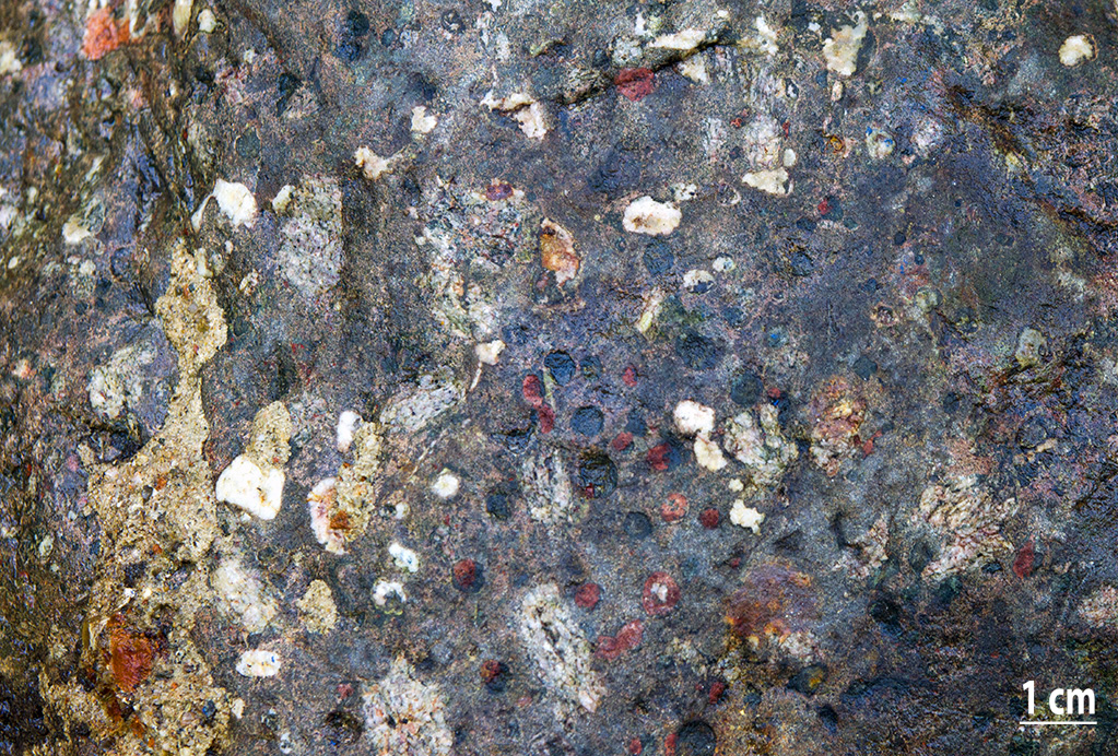 Denne prøve indeholder mandler (luftblærer i lavaen, der senere er udfyldt med mineraler).