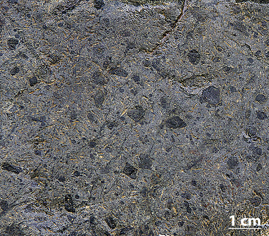 Her er tale om en basalt. En typisk basalt er en sort eller næsten sort, finkornet eller tæt vulkansk bjergart. Den er altså en bjergart opstået ved hurtig størkning af magma. Basalt består af diverse silikater, f.eks. olivin, pyroxen, amfibol og anorthit (Ca-rig feldspat). De mørke mineraæer er først og fremmest augit. Densiteten af basalt er mellem 2,8 og 3,0.