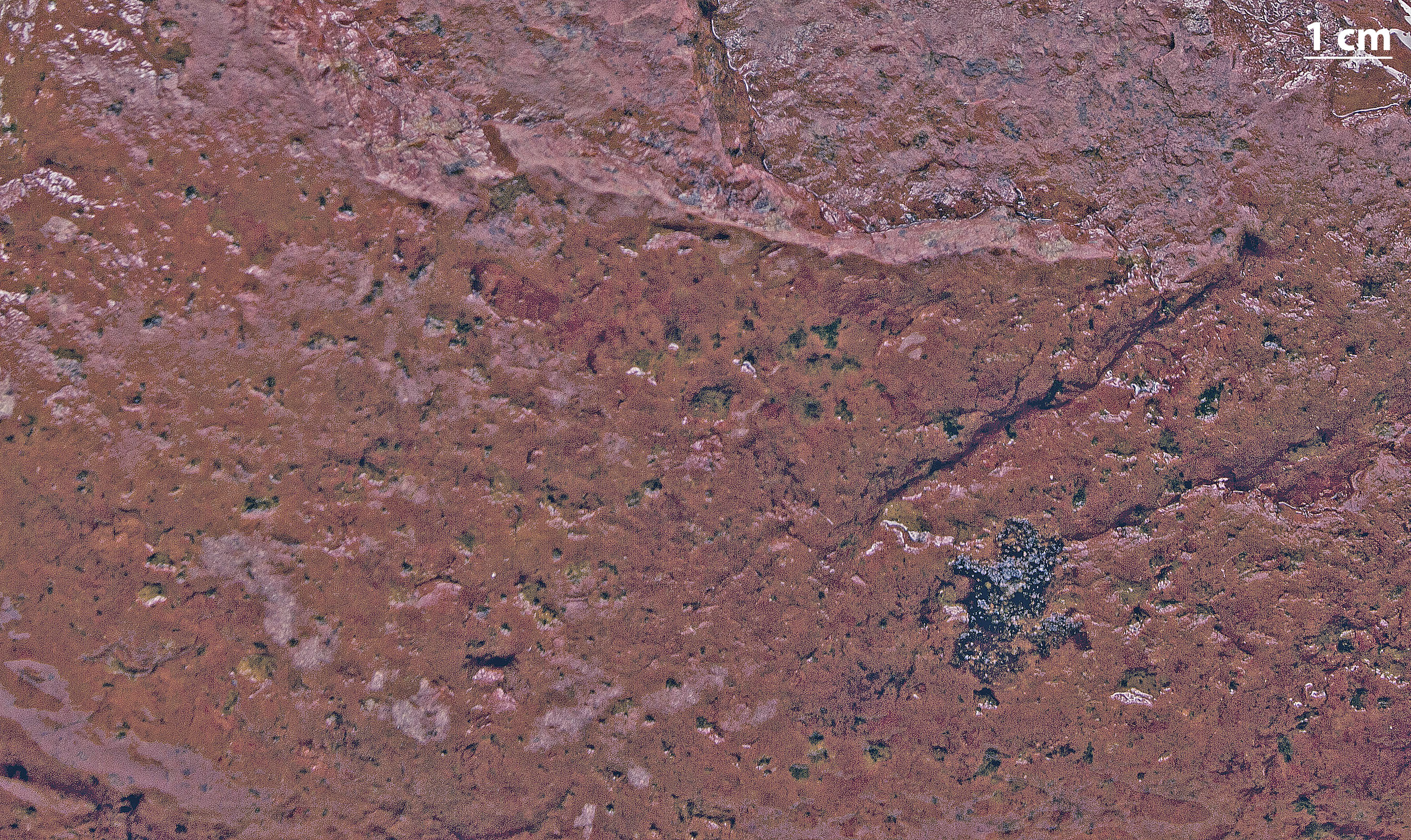 Typiske træk: Grundmassen er teglrød eller rødbrun, i forvitret stand lyserød. Ingen kvartskorn. To slags feldspatstrøkorn, begge 1-5 mm i tværsnit: 1) Kalifeldspatter, der kan være utydelige, fordi de kun er lidt lysere end grundmassen; 2) færre, lyst gulgrønne plagioklaser, der forvitrer ud og efterlader små, firkantede gruber. Kornene kan være samlet i utydelige striber. Ganske få, små, mørke strøkorn.