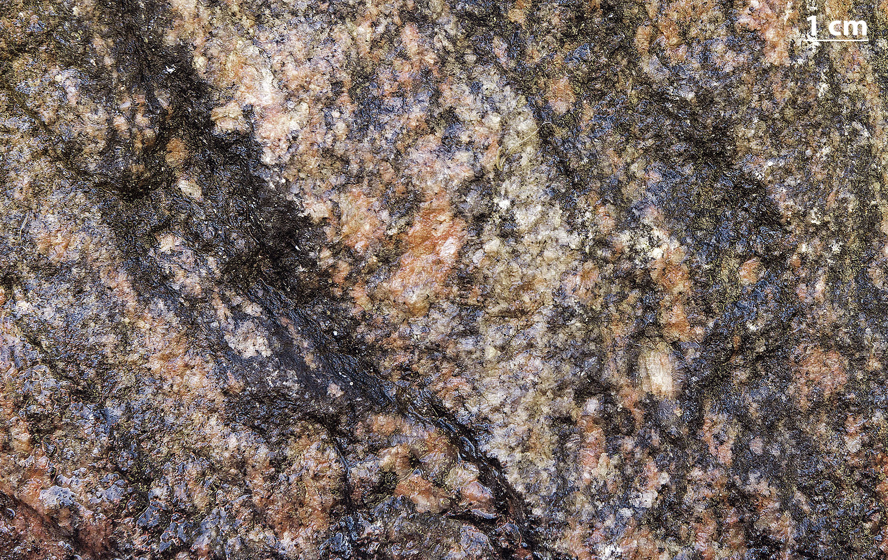 Denne prøve indeholder megen kalifeldspat (derfor den rødlige farve).