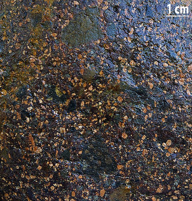 Grundmassen er grå eller brun. Mange tætliggende, 2-5 mm store strøkorn af kvarts (grå) og feldspat (beige, lysebrune). 1-5 cm lange, lyse- eller mørkebrune ignimbritstriber (pimpsten), og hyppigt fremmede bjergartsstumper, de fleste basalt (sorte, nogle dog brune). Bjergarten kan minde om et terrazzogulv.