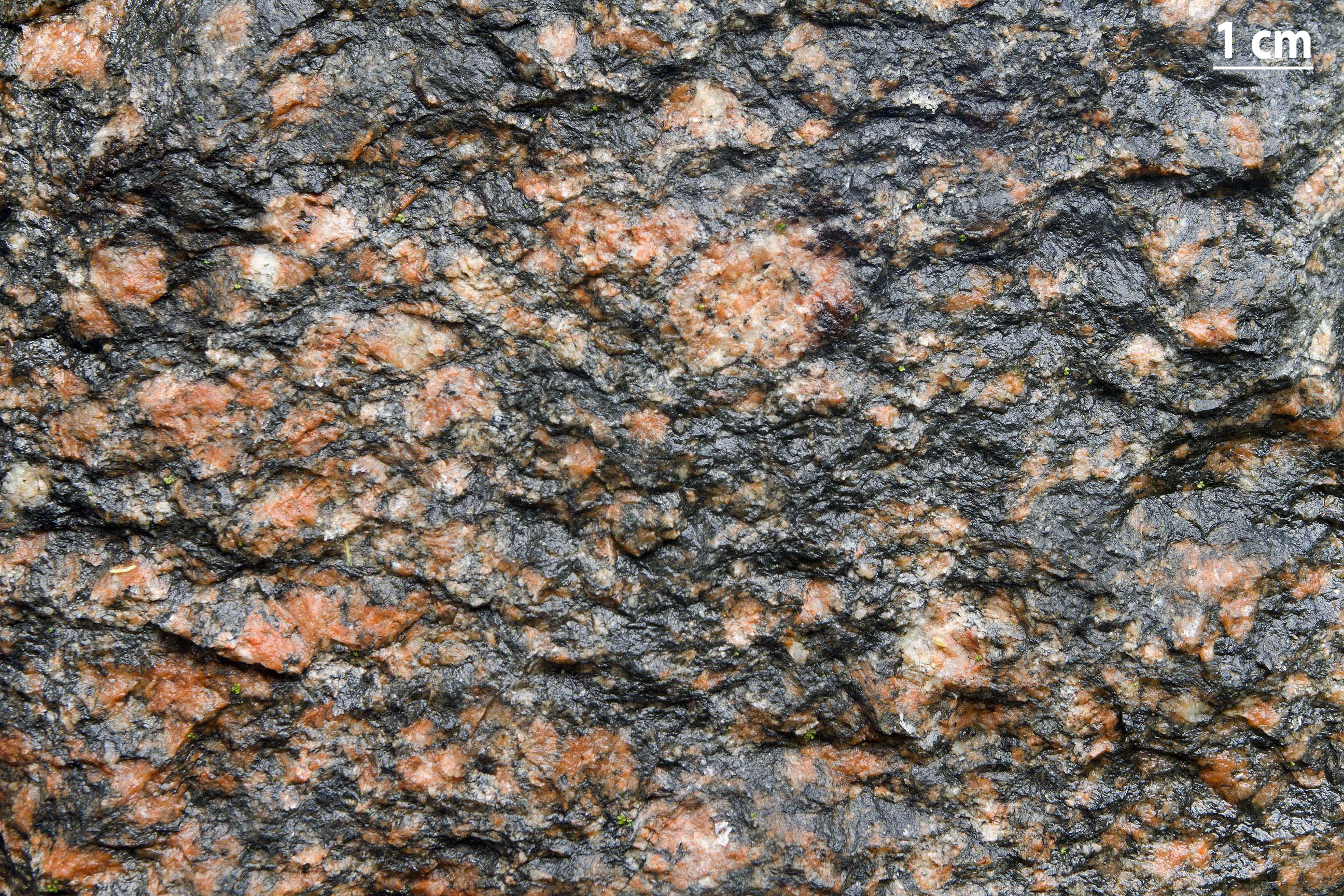 Striberne i gnejsen går uden om feldspat-kornene, og det tyder på at kornene er dannet før gnejsen blev dannet.