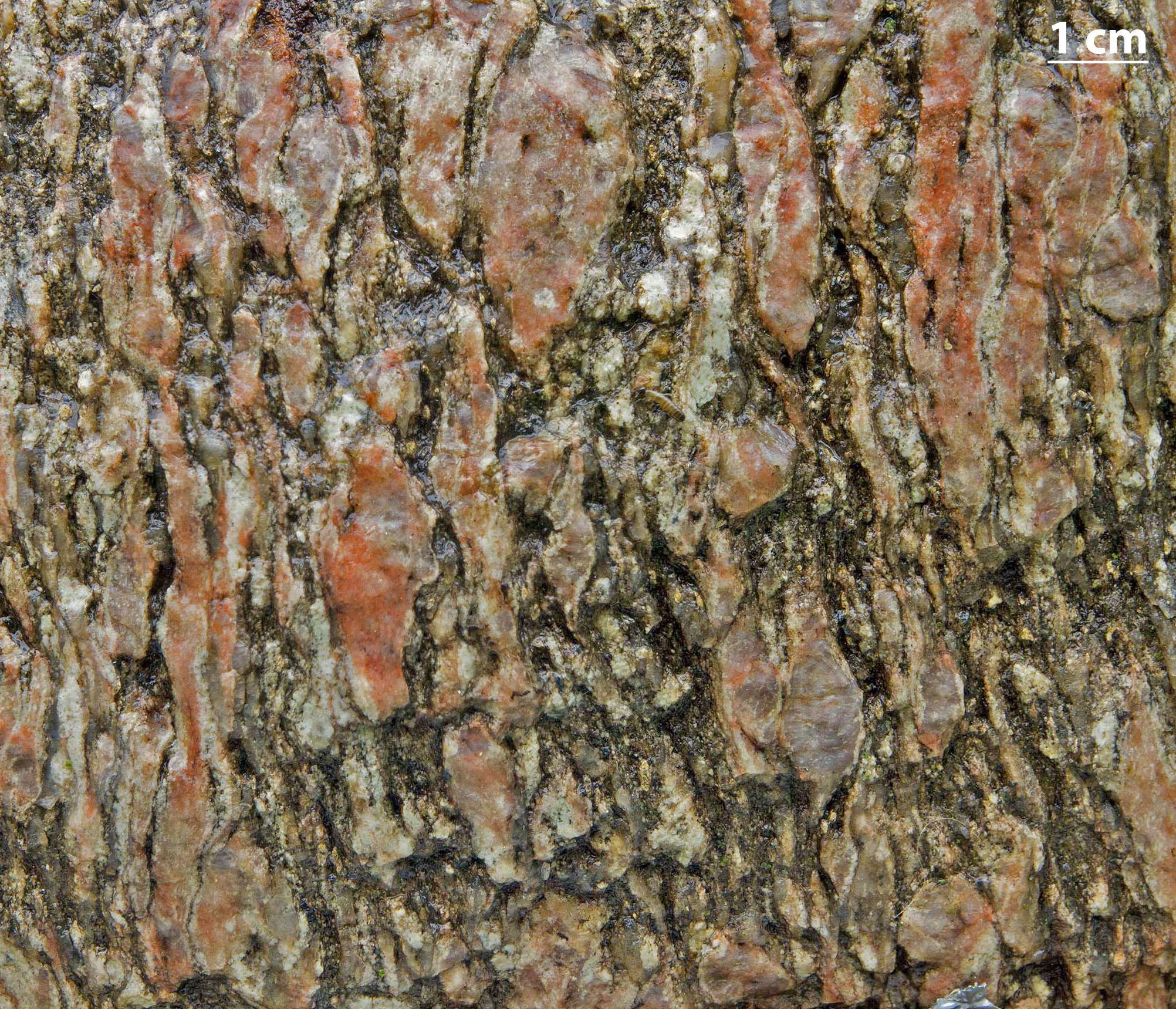 Striberne i gnejsen går uden om feldspat-kornene, og det tyder på at kornene er dannet før gnejsen blev dannet.