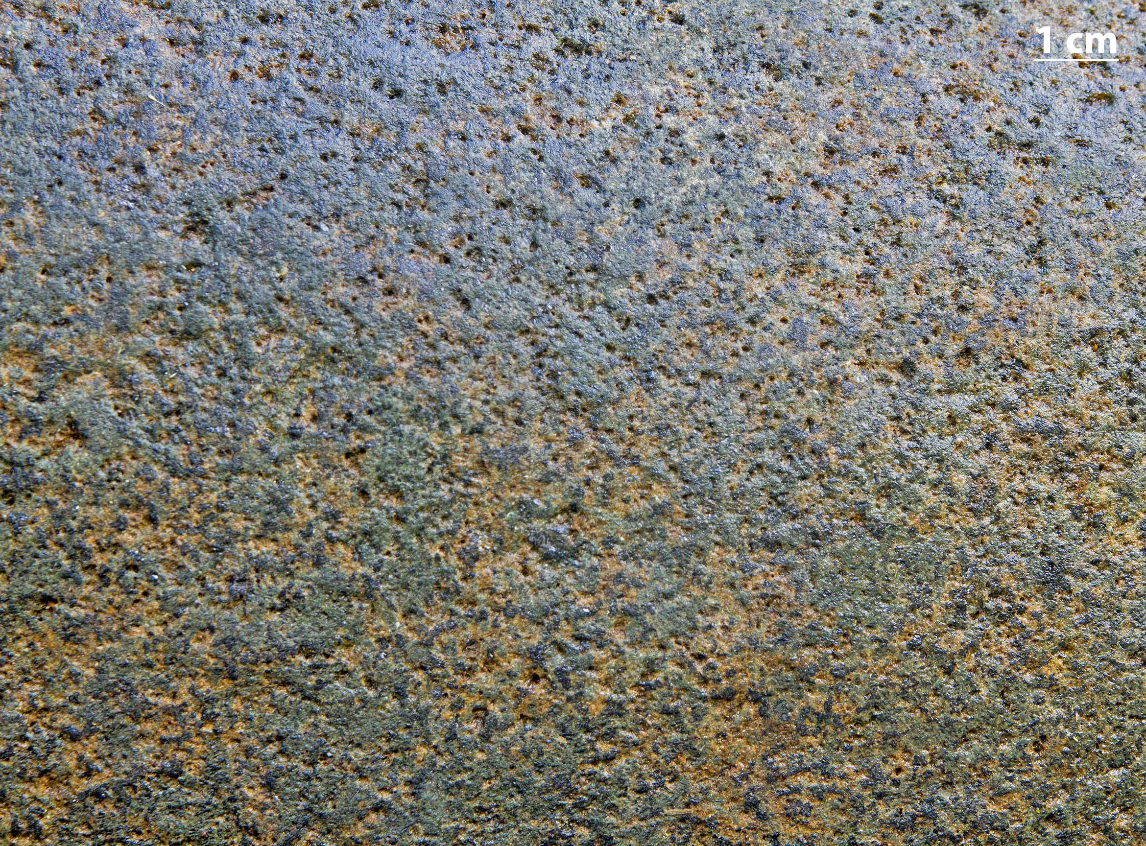 Gråsorte, 2-4 cm store augitkrystaller med rundagtigt omrids gennemvokses af mange ca. 1 mm lange lyse plagioklaslister. Mellem augitkrystallerne findes olivinkorn, der netop er synlige i lup. Mange af dem er omdannet til serpentin eller rust.