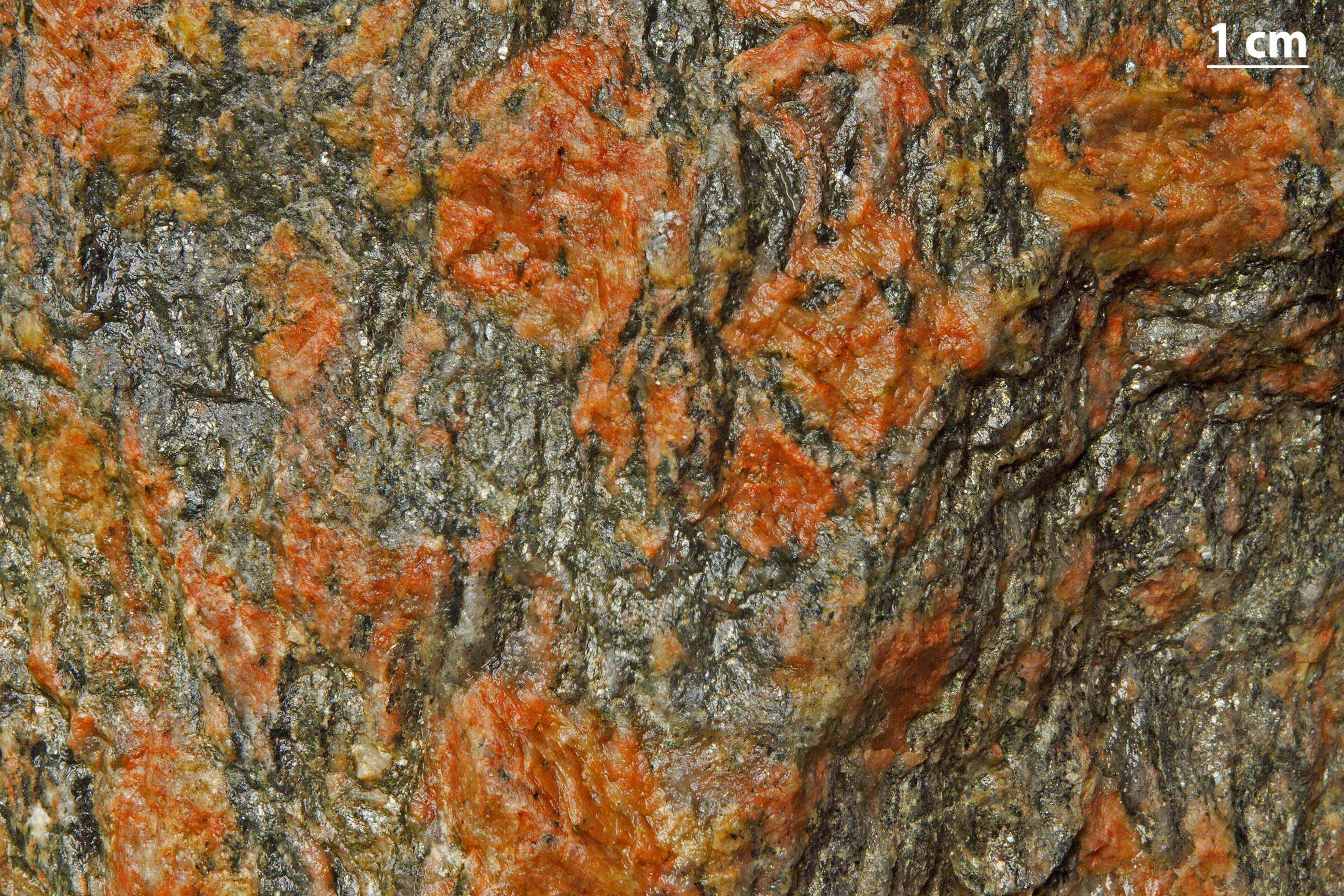Striberne i gnejsen går uden om feldspat-kornene, og det tyder på at kornene er dannet før gnejsen blev dannet.