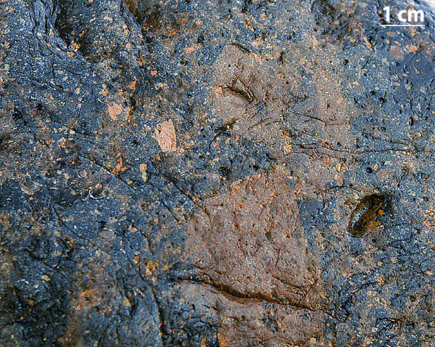 Denne sten indeholder masser af stumper af syenitporfyr. Disse brudstykker er revet løs fra siderne af krateret under de eksplosive udbrud. Stumperne antyder, at stenen er opstået ganske nær ved udbrudsstedet.