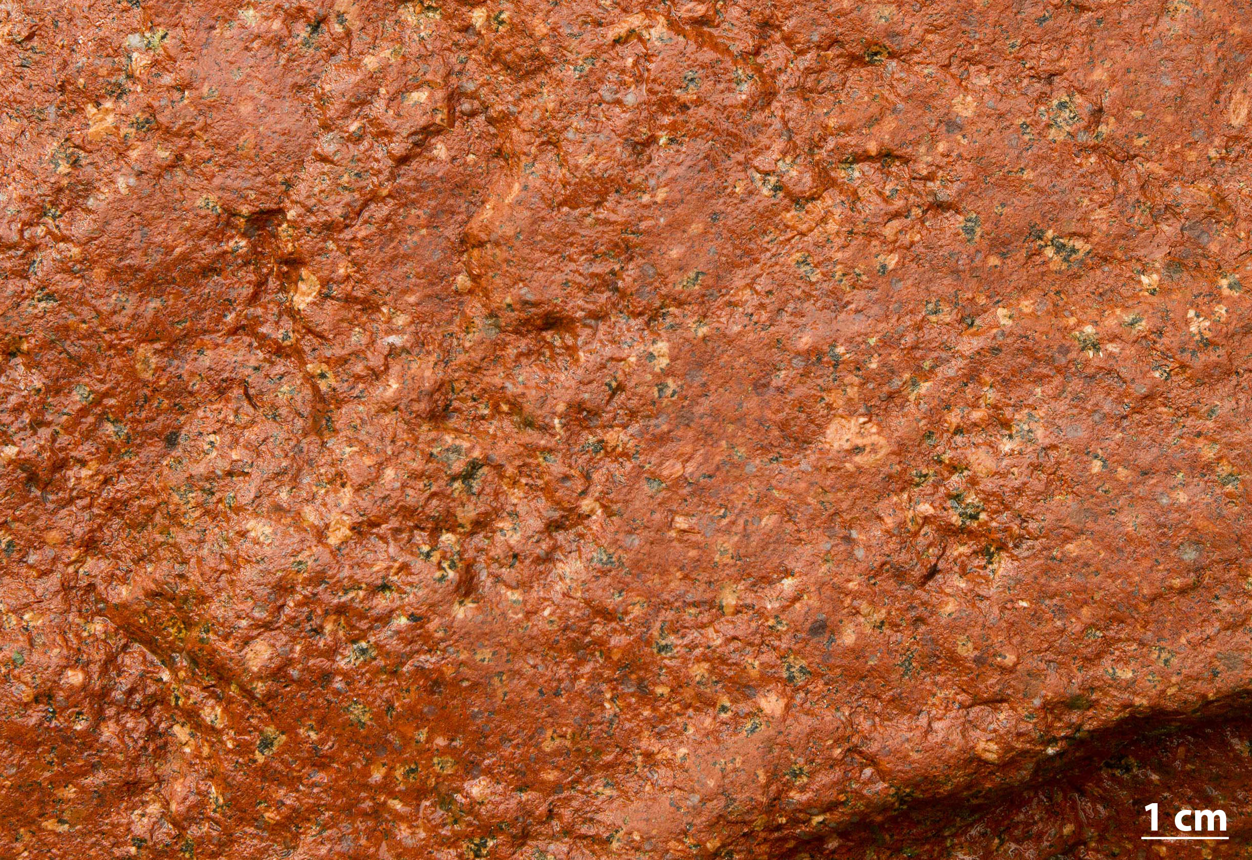 Denne prøve er rapakiviagtig og minder om en ålandsrapakivi. En rapakivi opbygges af afrundede korn af rødlig kalifeldspat omgivet af en rand af hvid plagioklas. Der er to generationer af kvarts, en tidlig, der består af veludviklede krystaller, og en sen, der består af afrundede krystaller og udfylder mellemrum mellem andre mineraler.